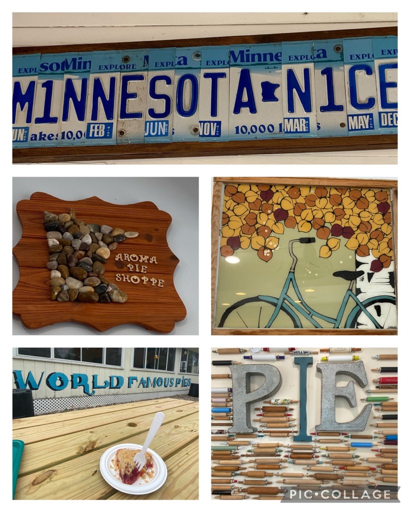 We rode from Lanesboro to Rutherford and passed through several other charming towns, all of which had cute cafes advertising pie. Our first stop – yes, there was more than one…was The Aroma Pie Shoppe. I had raspberry peach crumb. It was delectable. Tim had coconut cream pie. It was mouthwatering as well. We returned to the van and had salad for lunch. Our last stop before departing Lanesboro was the Home Sweet Home Cafe. We shared a piece of blackberry pear pie.