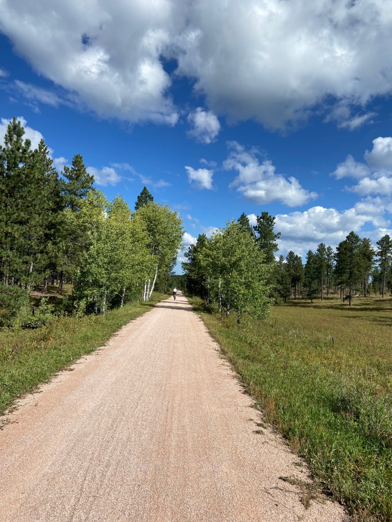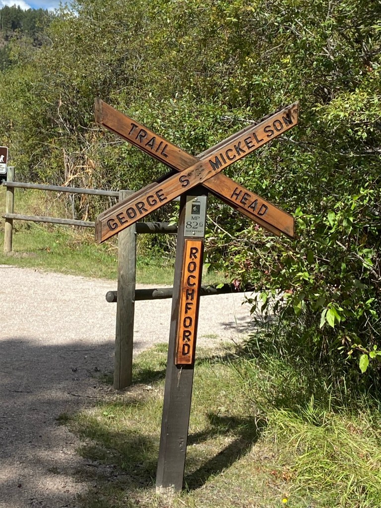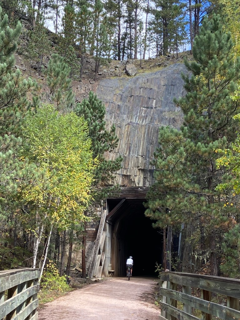 We boondocked in Custer, SD at the George S. Mickelson Trailhead. This is one of Tim’s favorite trails in the world. This was my first time on the trail. The full trail is 109 miles long and contains more than 100 bridges and 4 rock tunnels. It goes from Deadwood to Edgemont. It follows the historic Burlington Northern Railroad route. The trail is crushed limestone and is never flat. It’s either going uphill or downhill. We rode the trail from Custer to Rochford 38.6 miles. Custer to the next trailhead was 5 miles all uphill. But later on we had 9 miles all downhill!! It continued with long stretches up then down.