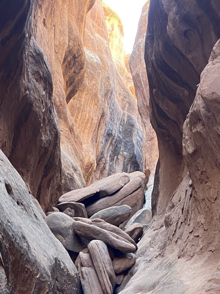 We drove straight to the Fiery Furnace trail head. We were the first car in the lot. At the required meeting yesterday, the Ranger talked to us about there not really being much of a trail through the Fiery Furnace. There are a few arrows and you really have to watch for them. One big thing is to walk in only rock or the washes, so as not to disturb the delicate soil crust in the desert.