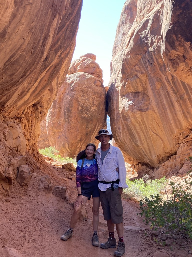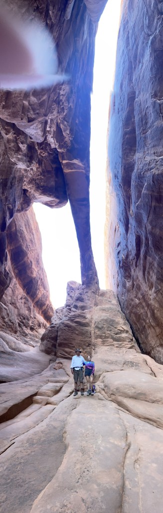 We ended up hiking the last 1/3 of the trail with them and it was very fortunate we did. Brendan (the guy) is the acting superintendent of Arches and he was showing his cousin Megan around. We found a cool surprise at one dead end – Surprise Arch and Brendan took our picture for us. It was one of, if not the best hike we’ve ever done!