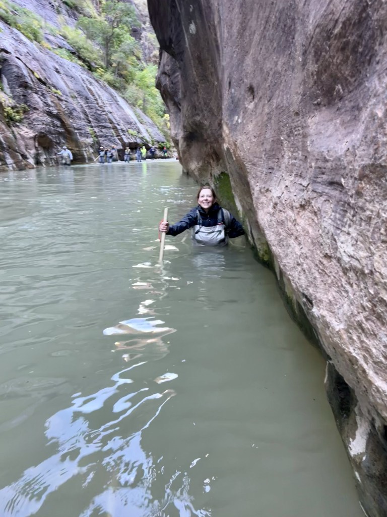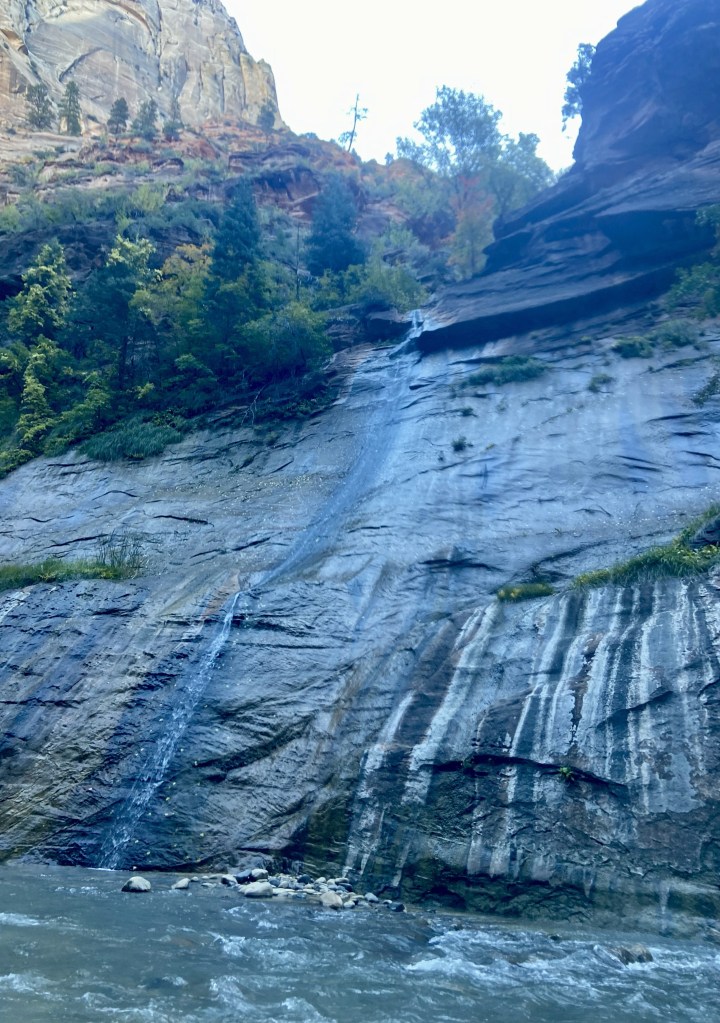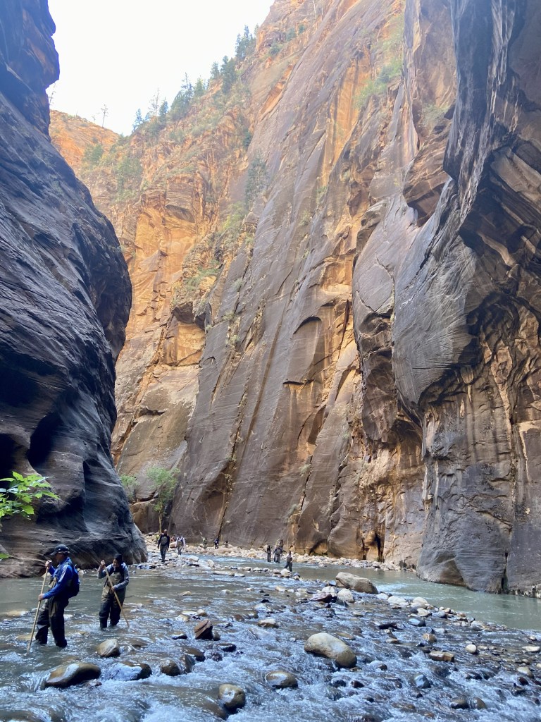 We did the same thing as yesterday – got up early and drove from the campground to the VC parking and got ready for the day. It was about 41 degrees as we got ready for The Narrows. The Narrows is a hike IN the Virgin River! Many people go to where the river splits in two. Where the river splits is the start of The Wall Street section where the canyon gets very narrow and the current gets very strong. The flow rate today was over 70 cubic feet per second which was significant. They don’t close the Narrows unless the flow rate is 150 cubic feet per second or more, but a comfortable flow is 50 cubic feet per second or less.