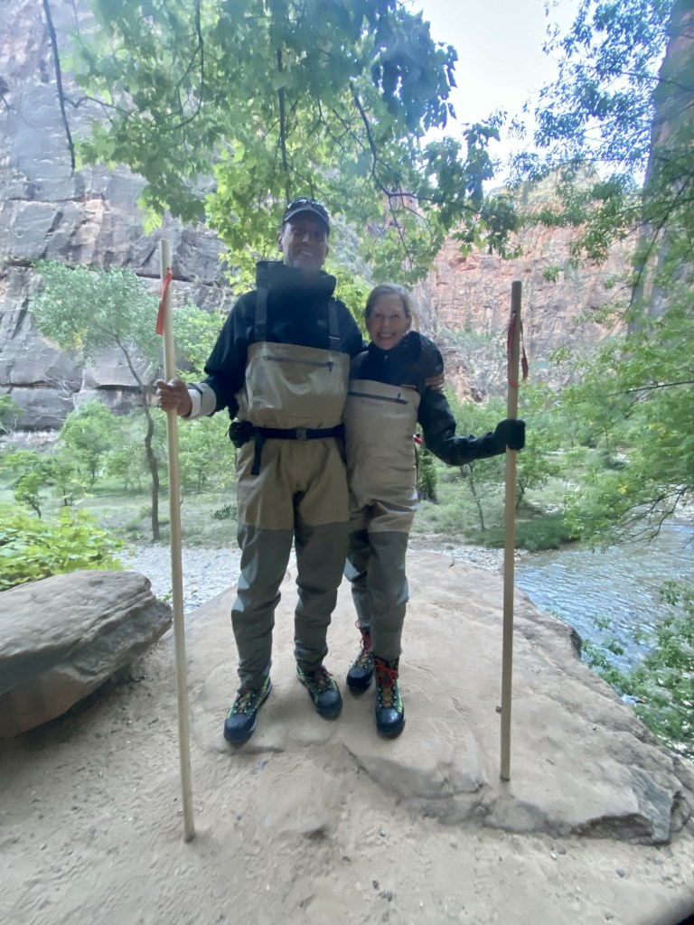 We took the shuttle back to the VC and ate lunch. A ranger recommended a beautiful drive to Kolob Reservoir. So we did that this afternoon. Well worth it! Then we got our gear for the Narrows hike from Zion Guru. We opted for the bib waders with neoprene socks and special hiking boots and long sticks for assessing water depth. We got fantastic service from Nick! Such a sweetheart!