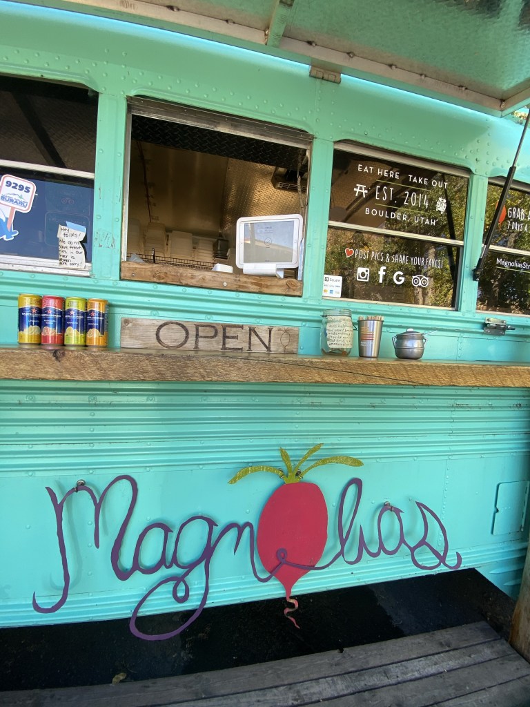 Our friend Stan had told us that he had the best burrito of his life at a place in Boulder called Magnolia Street Food. We were astonished and excited to see that Magnolia Street Food was a converted bus off the parking lot of the Anasazi Museum!! So we each had a burrito for lunch. Stan was correct! Amazing burritos! They were huge, so we each saved the other 1/2 for dinner.