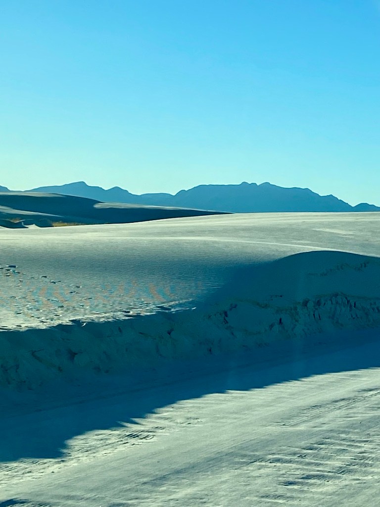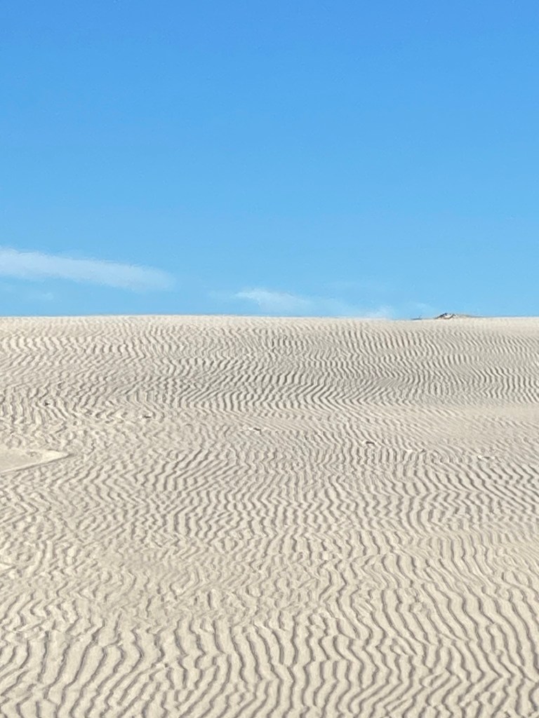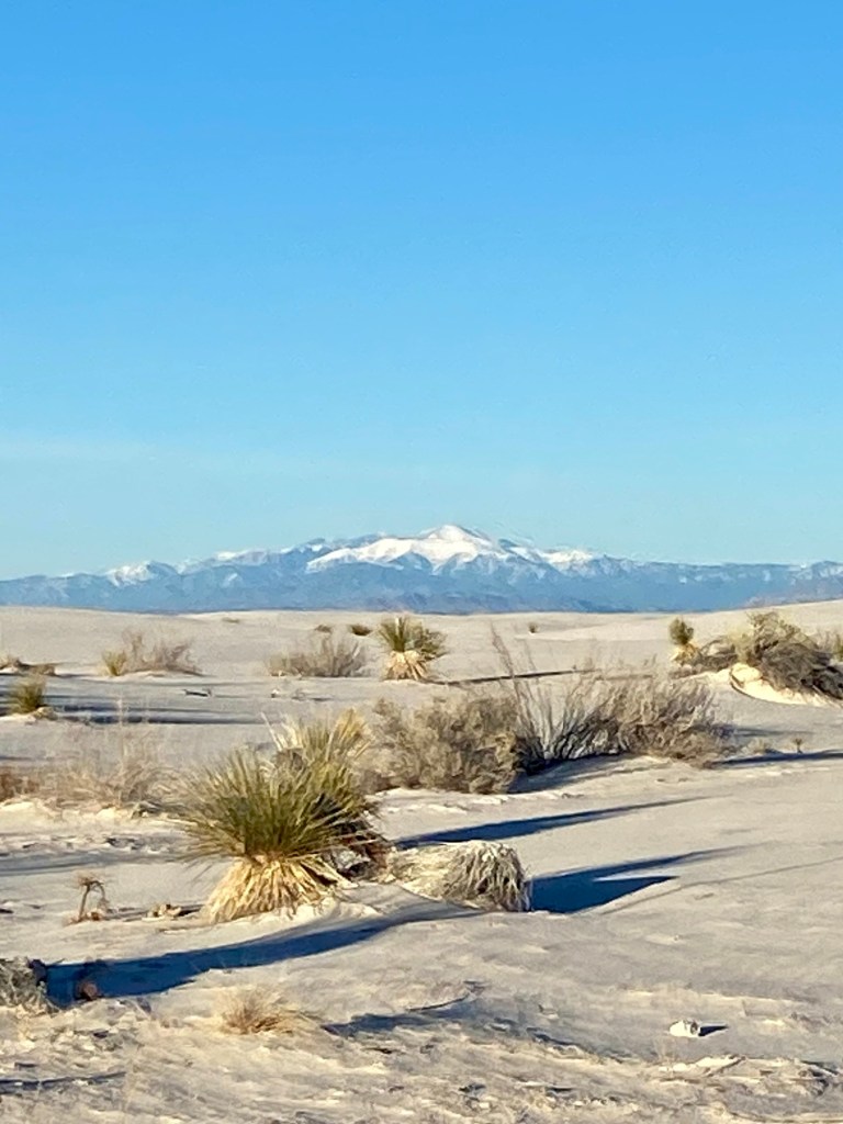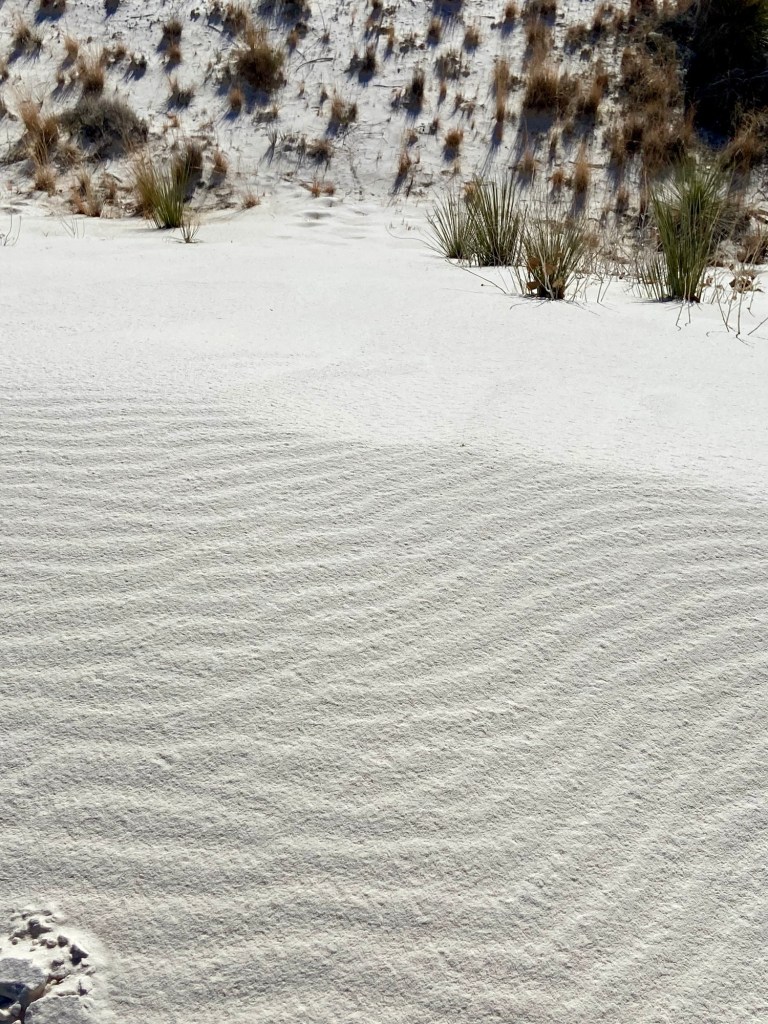 These white sand dunes are different from most other sand dunes because they are gypsum. The gypsum dunes are cooler and firmer than other kinds of sand. These are the largest gypsum sand dunes in the world. We were told they can be seen from space.