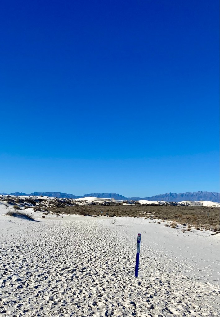 Since the footprints get erased by rain and wind and the dunes are continuously moving, the trails are marked by posts and you navigate the trails by  looking for the posts. Since the gypsum sand packs well, it was easier to walk these dunes than other sand dunes we’ve been on.