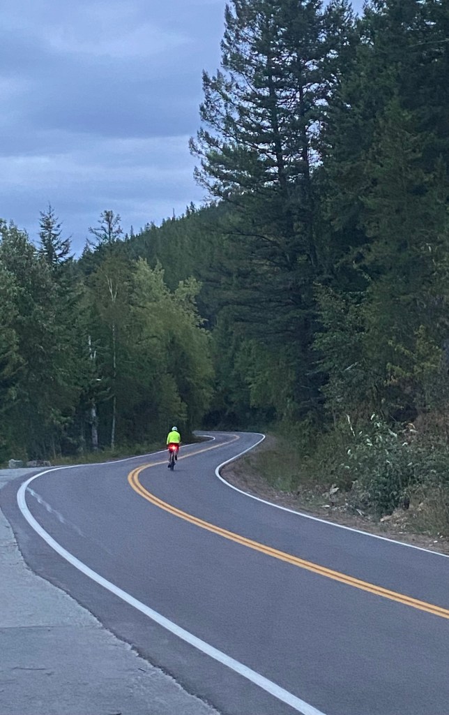 Glacier has implemented a reservation system to be allowed to enter the park at two of the most popular entrances – Going to the Sun Road from the West and Many Glacier. Glacier was not an original part of this trip. But after we decided to meet up with some friends while we were out here, it was too late to get a reservation. They do have a couple spots that you can try to get at 7 PM the night before, or you can arrive into the park before 6 AM without a pass. We didn’t have cell service, so we were up at 5 AM to get into the park before a reservation was needed. Although Apgar campground is “in” Glacier, staying there does not get you onto Going to the Sun Road. So, Tim and his bike were in the van ready to ride, and I drove the van to the first pullout inside the reservations needed area and we waited for the sun to come up around 6:45.