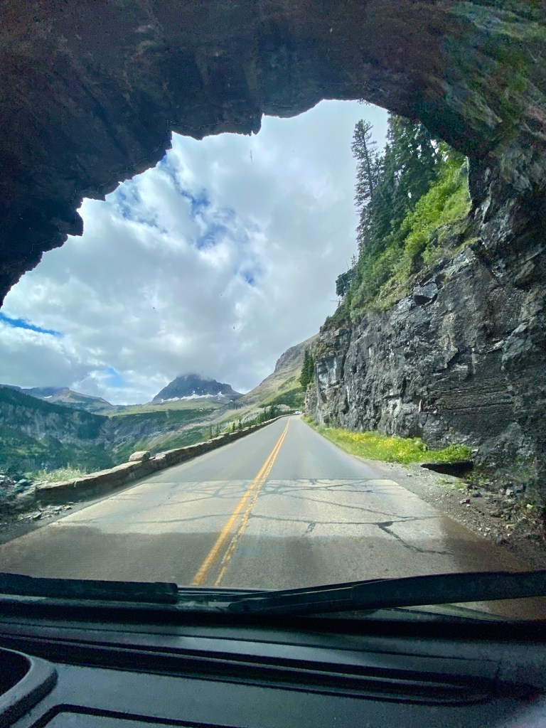 I say that because especially from west to east, you are driving a narrow, twisting road right up against sheer drop offs. Tim wanted to be very visible on the road because there is no shoulder. He had two flashing lights on the back of his bike and one on the front. He was also wearing a fluorescent jacket. At 6:45 he set off. The plan was for me to drive up to Logan’s Pass, the high point of the drive and wait for him.
