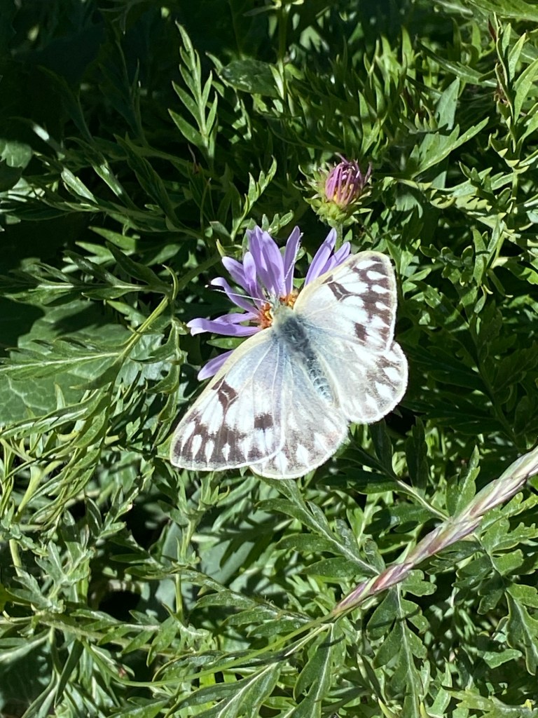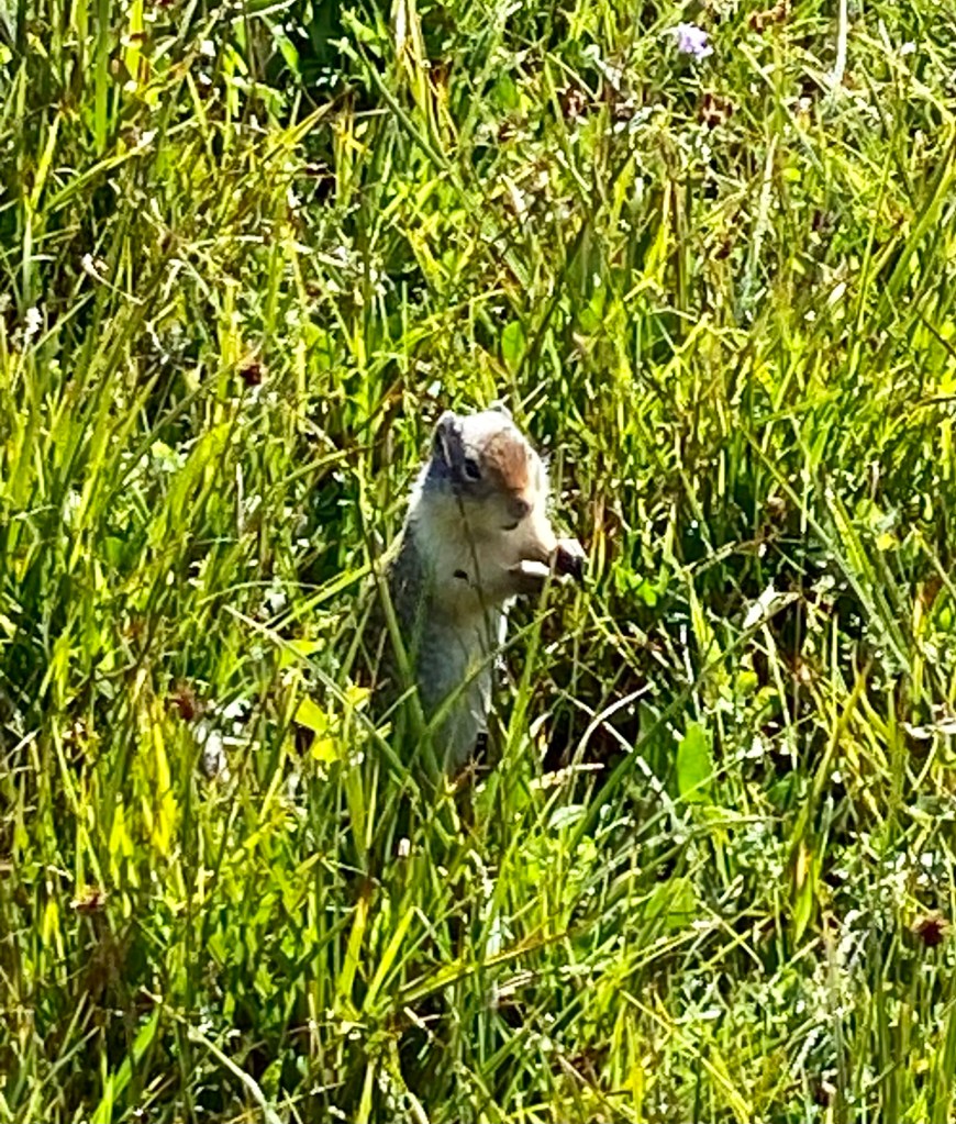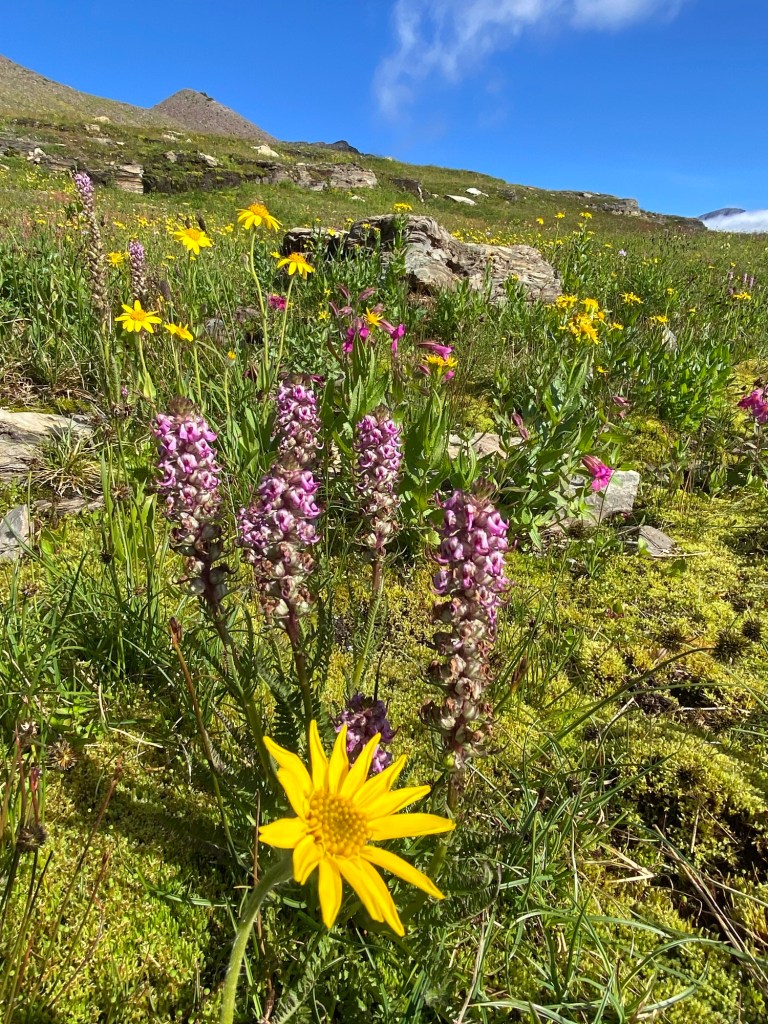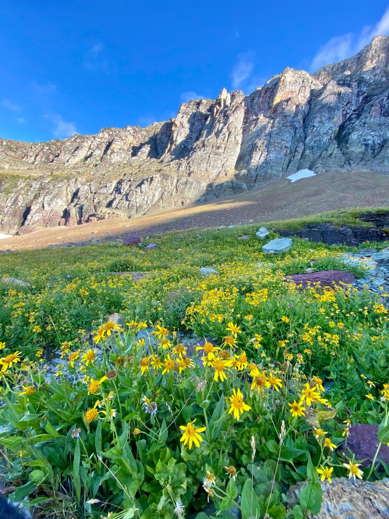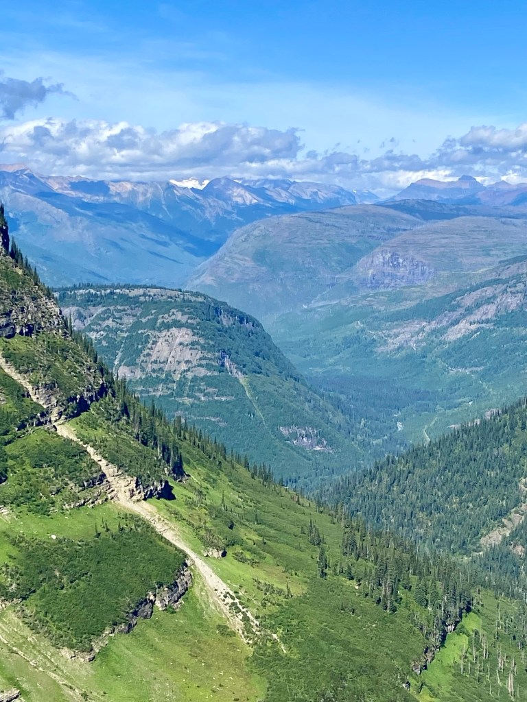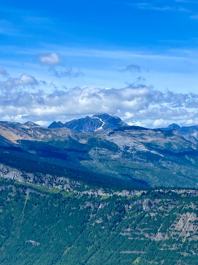 We were up and out at 5:30 AM racing up GTTSR to Logan’s Pass to get a parking space. We were there at 6:45 AM and the lot was almost full, but we did get a spot. We decided our first hike would be Hidden Lake, a moderate 6 mile out and back hike with 1339’ of elevation gain. The first 1.5 miles is a series of boardwalks up to Hidden Lake Overlook. The wildflowers were exploding, and we saw one Bighorn Sheep and a variety of marmot and whistle pigs. We continued on with another 1.5 miles of steep downhill to the shore of Hidden Lake. The lake was calm and the clouds and mountains reflecting in it were perfection.