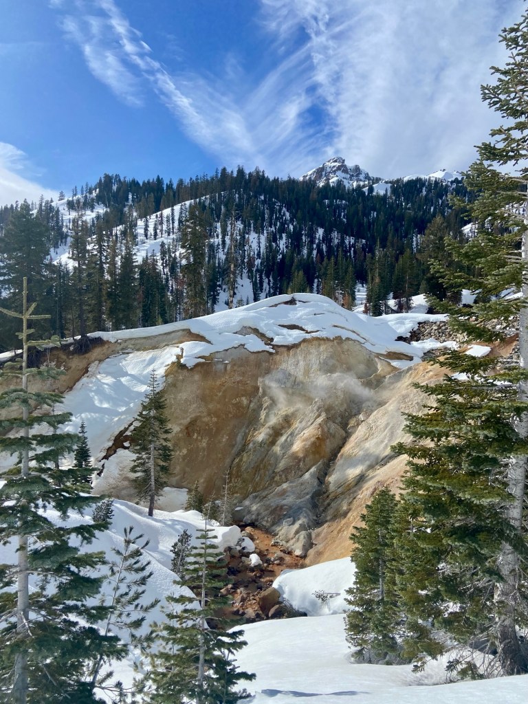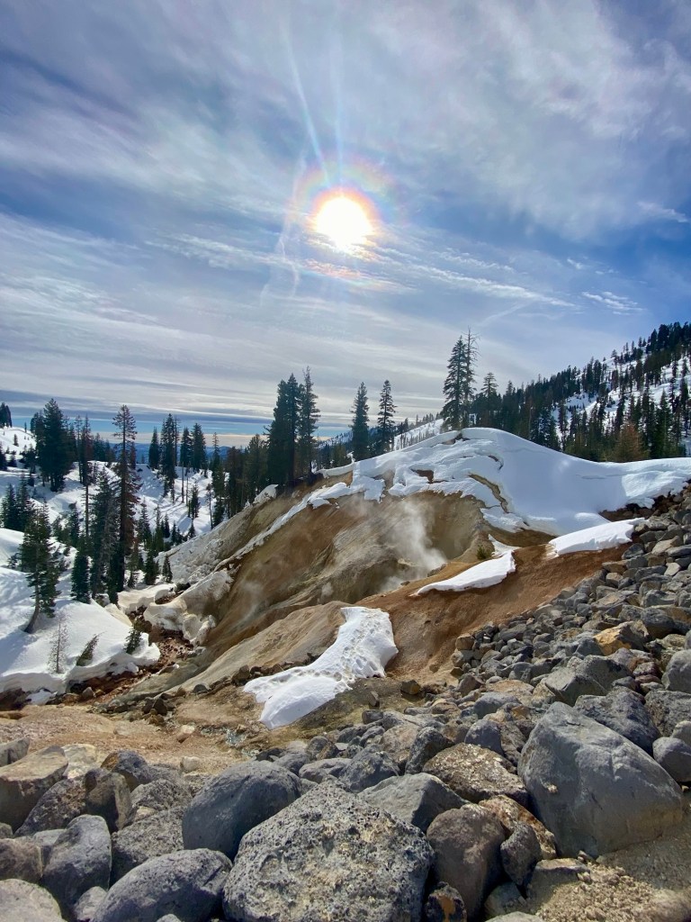 We entered the VC and got the passport stamp. We talked to several rangers. We learned that all the dead trees we saw on our way in were actually burned by the 2021 Dixie Fire, that burned more than 960,000 acres and is the second largest wildfire in California history. We watched the park movie. We learned there are four types of volcanoes. The last eruption of Lassen Peak was in 1917. Pretty much the only trail that was open is called The Sulphur Works Trail. It is a 2 mile round trip hike on a packed snow trail. It was quite icy. We would have liked to have our micro spikes with us. At the end of the trail there are boiling mud pots and hissing steam vents. It is reminiscent of Yellowstone.
