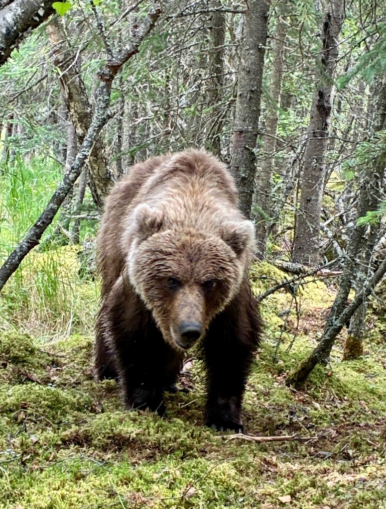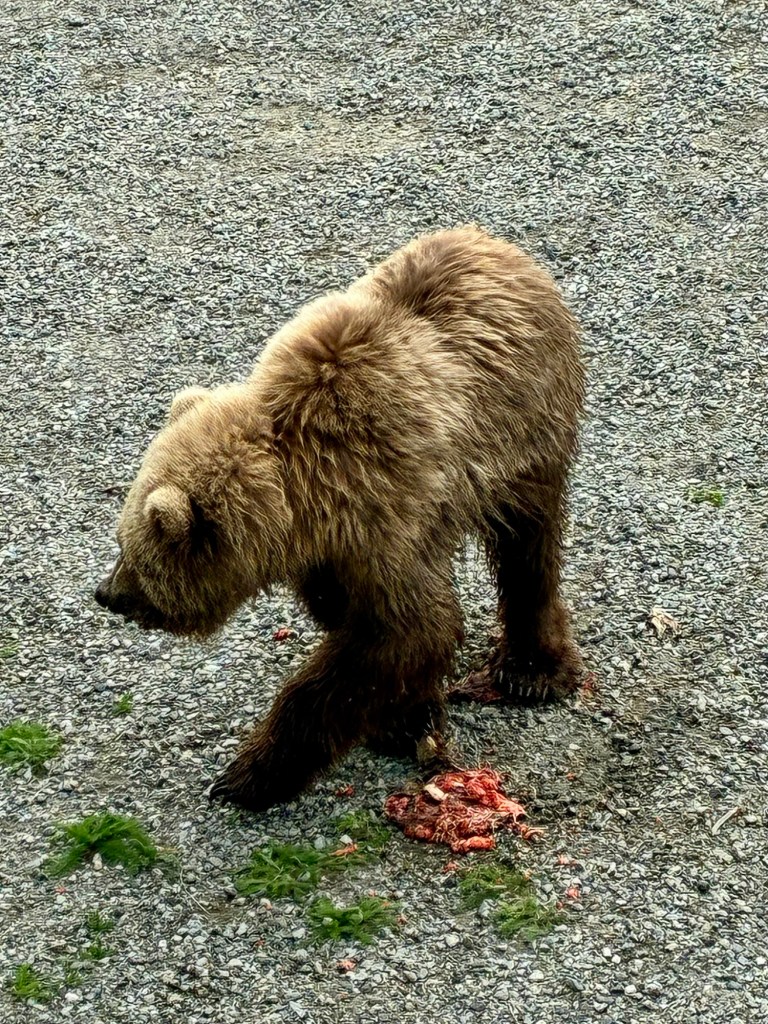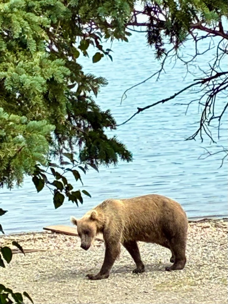 Then Tim and I hightailed it out to the Brooks Falls platform to get on the list for the viewing platform. I don’t know if it was because it was a Monday, but when we got to the platform the wait was less than three minutes. Other people had warned us that wait times of a half hour or more are common.  They allow you to stay on the main platform for 30 minutes.  We spent our half hour on the platform at the falls but it felt a little anti climactic to me. There were only two bears at the falls and both were on the far side of the river, so photographs from an iPhone weren’t great. We went over to the other platform and there was only one bear, but it was pretty close to the to our viewing station.  There were a bunch of fishermen in the river with the bear, and everyone was doing their own thing. At this point in the season the bears are very wasteful. They are mainly eating the head, the skin, and the roe or eggs of the female as those are the highest protein parts. The rest of the fish they just abandon. In the half hour we were at the falls, Tim and I think we only saw 2 or 3 salmon make it up the falls.