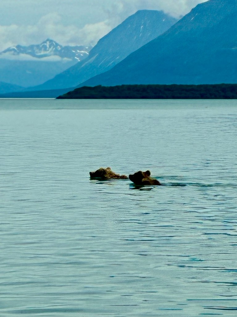 We made it back to the VC and retrieved our box lunch. We went into the picnic area that is fortified against the bears with an electric fence and had lunch. Afterwards, we walked down to the beach and took our photo with the NP sign. We found our pilot Mike and the other couple that came out with us. We said we were OK with heading back to the plane.  As Mike was preparing the plane, a sow and a yearling came out of the woods to our left and sat for a bit and then decided to go for a swim. They swam from our right to our left and the waded back out into the woods right by our plane.  It was a great end to Katmai.