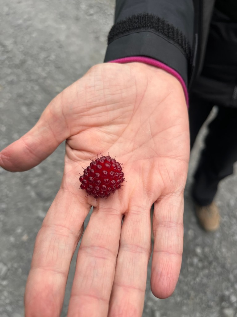 We were walking .7 miles to our hotel from dinner when we walked by people picking salmon berries. The woman looked at Tim and said “Tim?” It was the woman he’d been talking to about Backroads! Lol. Salmon berries are yum.