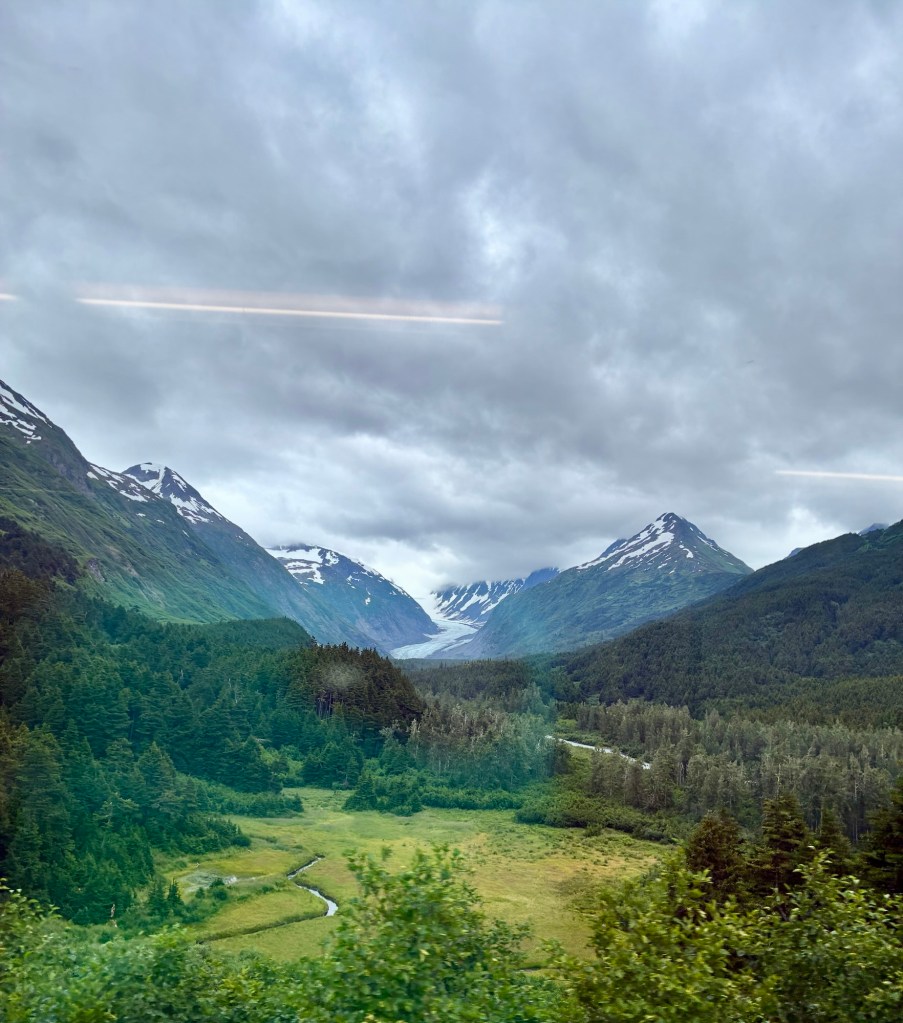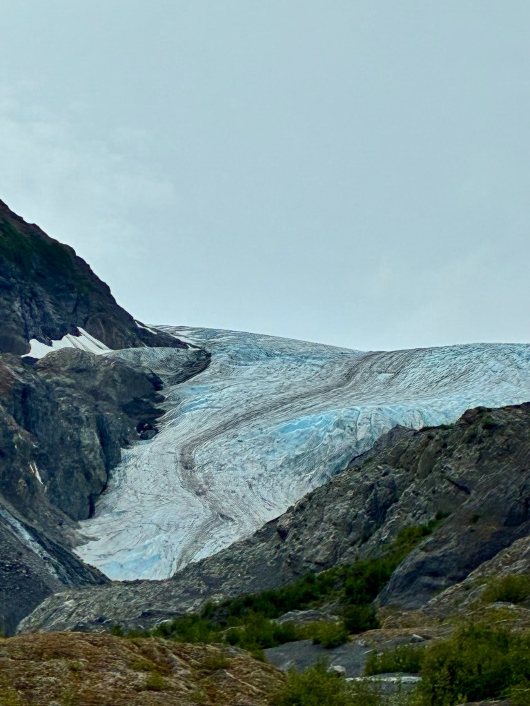 On the way to Seward, I looked up to see if there was a luggage service we could use. There’s a guy who will deliver your bags to your accommodation for $5 each. I emailed him and he said he’d meet us at the train station. We disembarked and found him. Then we walked into Seward and went to Kenai Fjords VC. We took our photo and stamped our passport and watched the movie. We asked the Ranger how we could get to Exit Glacier for the 2:30 Ranger led hike and he told us about a shuttle we can get. We walked over to reserve spots and walked around town until it was time to go. We arrived at Exit Glacier. At 2:30 PM a young Ranger named Naomi led us on a really informative hike. Naomi had a very cool story. Her parents were some of the original Rangers at Kenai Fjords in the 1980s when the park was created. She had a photo of herself by Exit Glacier when she was 6 or 7. Kenai Fjords has a version of the Jr. Ranger program for older kids called the Explorer Journal. It’s really amazing! We had to wait a while for our van to pick us up. A Backroads van pulled in. Tim went and talked to them.