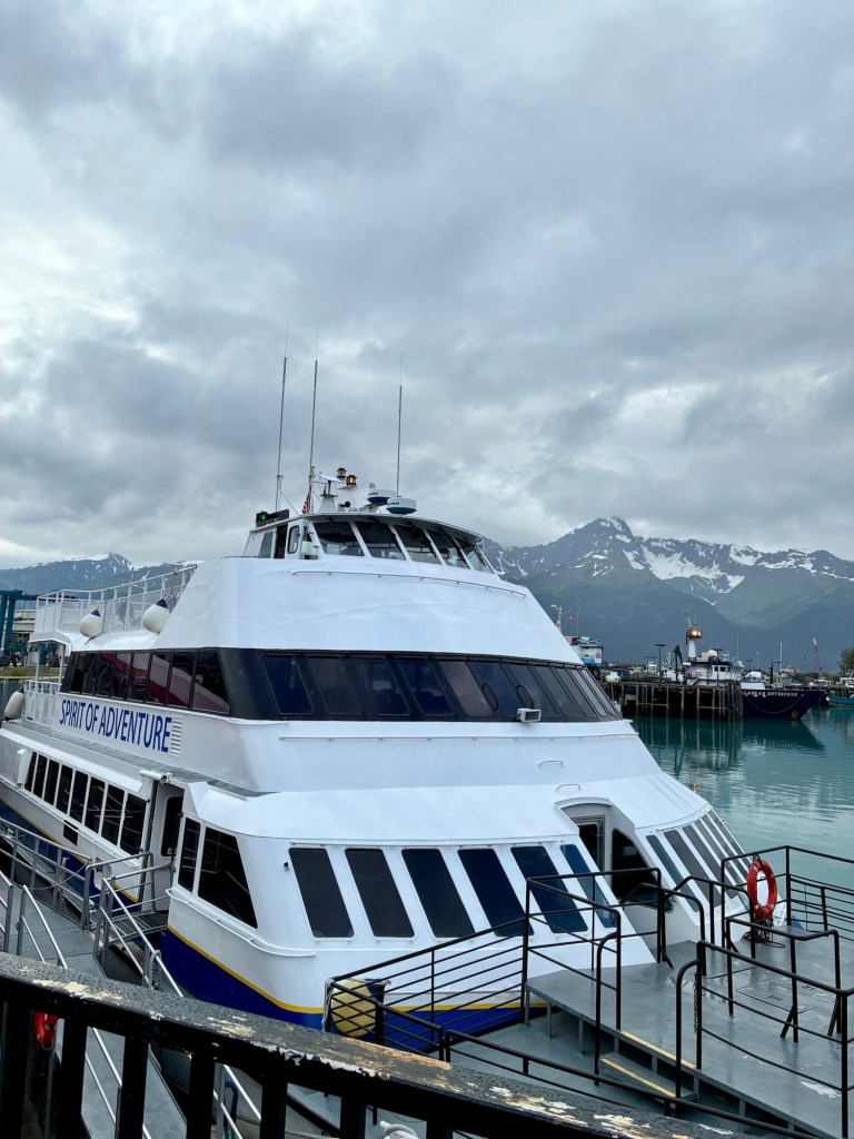 We couldn’t get an Uber to come to Steller Inn at 7:00 AM, so we walked the 2.5 miles to town and got breakfast sandwiches before we checked in for our marine tour of Kenai Fjords. We were on the Spirit of Adventure with Major Marine for a 7.5 hour tour. The Spirit of Adventure is a large boat with two enclosed floors and three outdoor viewing areas. The day started with gray skies and started to mist as we boarded Major Marine’s cruise.