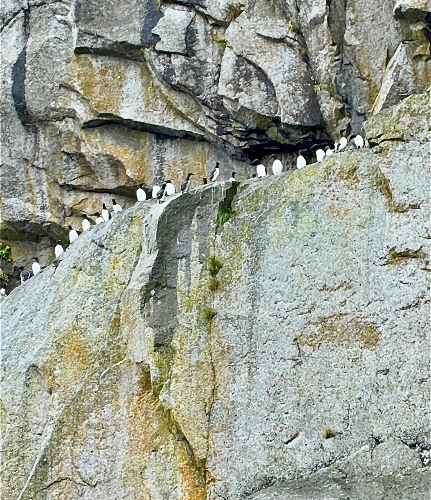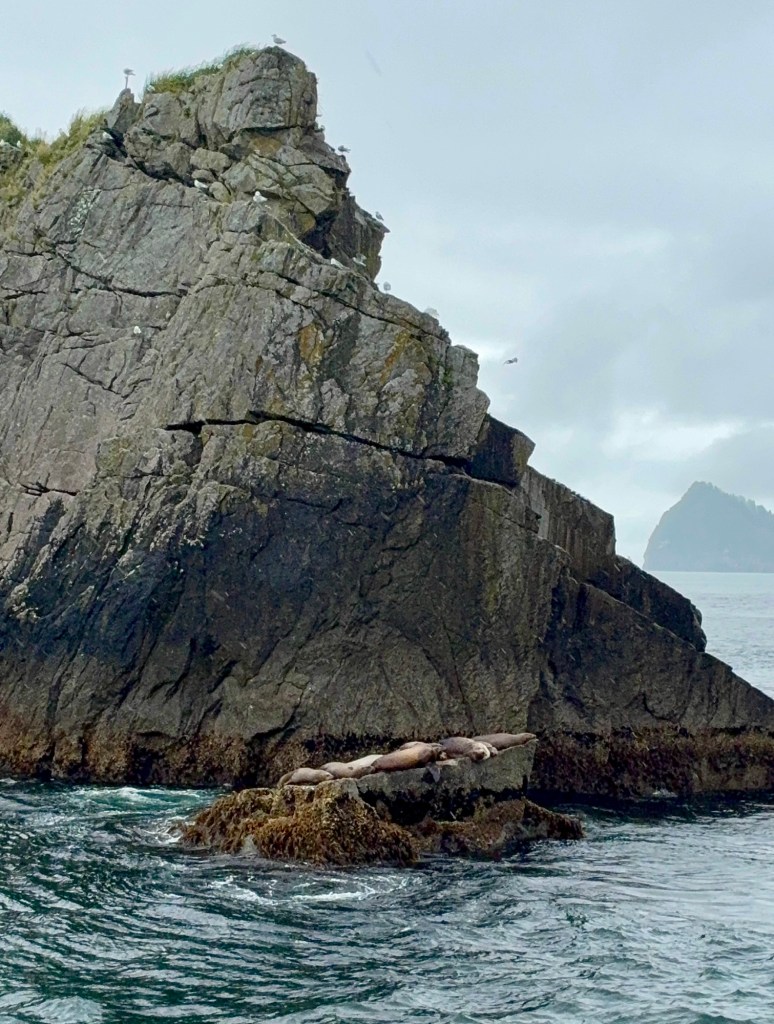 Continuing on, we saw sea lions lounging on rocks and puffins. We also saw Common Murre that resemble little penguins. They can drive up to 590 feet!! We had fun when a school of Dall’s porpoises played along side the boat for a while. We saw one or two humpback whales spout. But all of a sudden our captain told us to hang on because he was going to show us something cool. We approached a huge circle of birds flying right above the water. All of a sudden, 5-7 humpback whales were surfacing in a circle! It’s called bubble net feeding and they only do it for a few weeks in the summer. They cooperatively blow bubbles to corral schools of fish or krill into a tight vertical space, then lunge through the “net” with open mouths to feed. It is such an amazing sight to see them working cooperatively! The birds were an indicator of where the whales would surface.